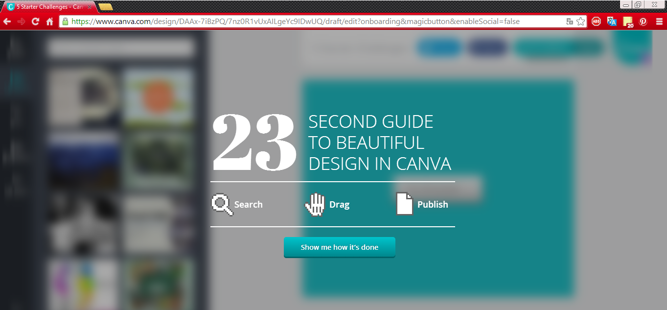 Al crear la cuenta nos da la bienvenida el sitio con un corto y útil tutorial de cinco pasos para aprender como diseñar en la plataforma.