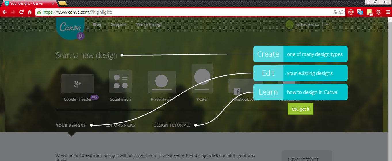 Terminando el tutorial el sitio nos describe la página de inicio que nos dará la bienvenida cada vez que entremos a la plataforma de Canva. En esta podremos diseñar nuevas imágenes, editar las ya existentes o acceder a tutoriales para mejorar las capacidades de diseño gráfico.