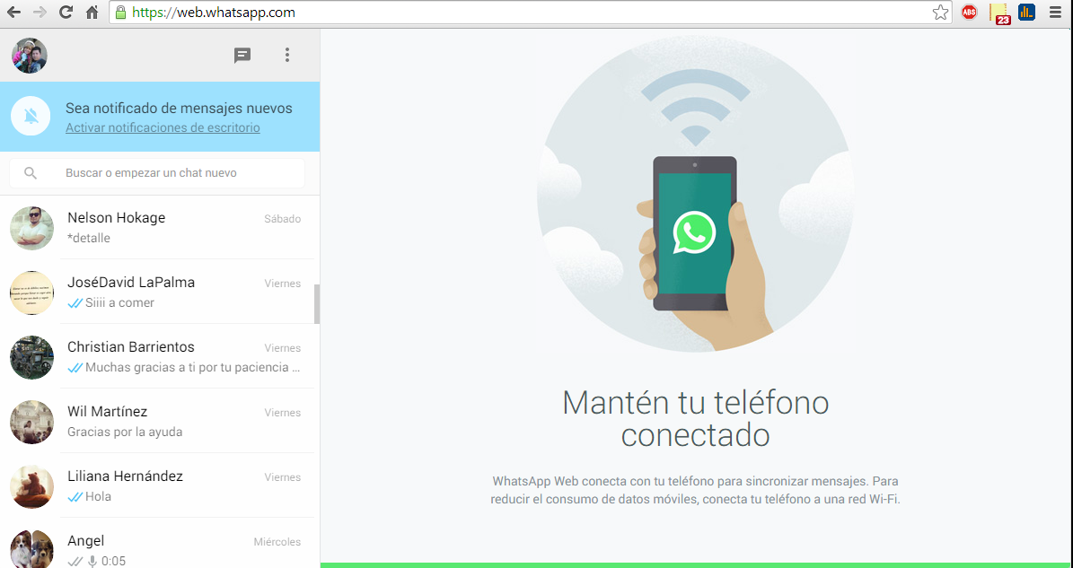 "WhatsApp Web Hoy, por primera vez, millones de ustedes tienen la oportunidad de usar WhatsApp en el navegador web de tu computadora. WhatsApp Web es una extensión de tu teléfono y refleja las conversaciones y los mensajes allí. Así, todos tus mensajes todavía se almacenan en tu teléfono. Abre https://web.whatsapp.com en el navegador Google Chrome en tu computadora para vincular WhatsApp Web con WhatsApp en tu teléfono. En esta página web hay un código QR, abre WhatsApp en tu teléfono para escanearlo y luego puedes empezar. Así, vinculas WhatsApp Web y WhatsApp en tu teléfono. Para poder usar WhatsApp Web es necesario mantener una conexión a internet en tu teléfono. También debes tener la versión más actualizada de WhatsApp en tu teléfono. Desafortunadamente, por el momento no podemos ofrecer WhatsApp Web para nuestros usuarios de iOS debido a limitaciones de Apple. Sinceramente esperamos que puedas disfrutar de WhatsApp Web en tu vida diaria." Publicación original de blog.whatsapp.com